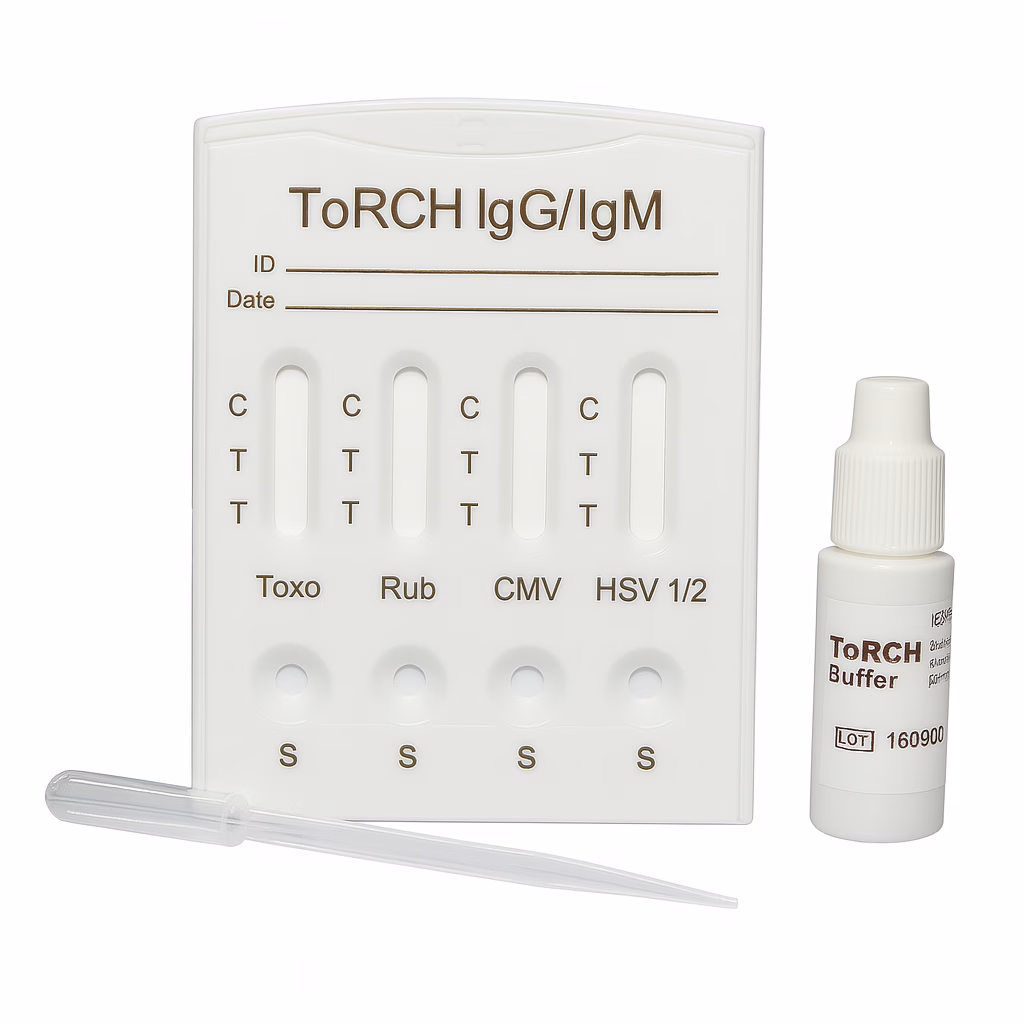 ToRCH IgM Antibodies Rapid Test A multi-panel lateral flow immunoassay designed to detect IgM antibodies for key ToRCH pathogens—Toxoplasma gondii, Rubella virus, Cytomegalovirus (CMV), and Herpes Simplex Virus (HSV). This rapid test provides qualitative results within minutes, supporting early diagnosis of congenital infections and prenatal screening in clinical settings.
